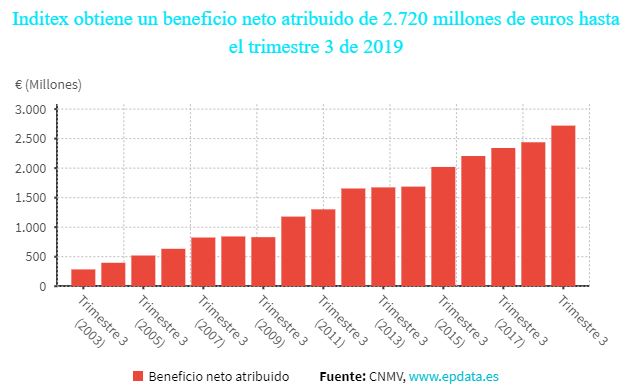 Inditex, la empresa más grande de España que opera en todo el mundo, ha visto crecer su cotización en bolsa en un 5% tras presentar sus resultados anuales de este 2019.